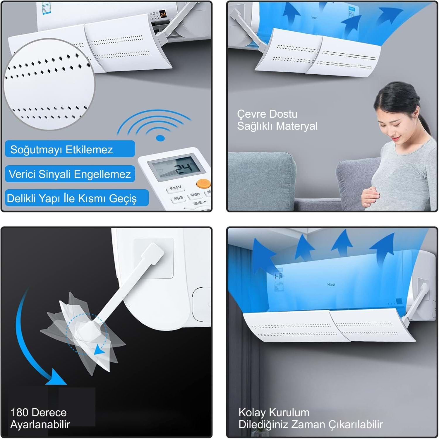 AYARLANABİLİR AÇI; Klima hava yönlendirici istediğiniz şekilde ayarlanabilir. Hava yönlendirici klimanın soğutmasını etkilemez ve uzaktan kumanda sinyalini engellemez. Panelde hava delikleri vardır kısmi hava geçişi sağlar ve yoğuşma olmaz.