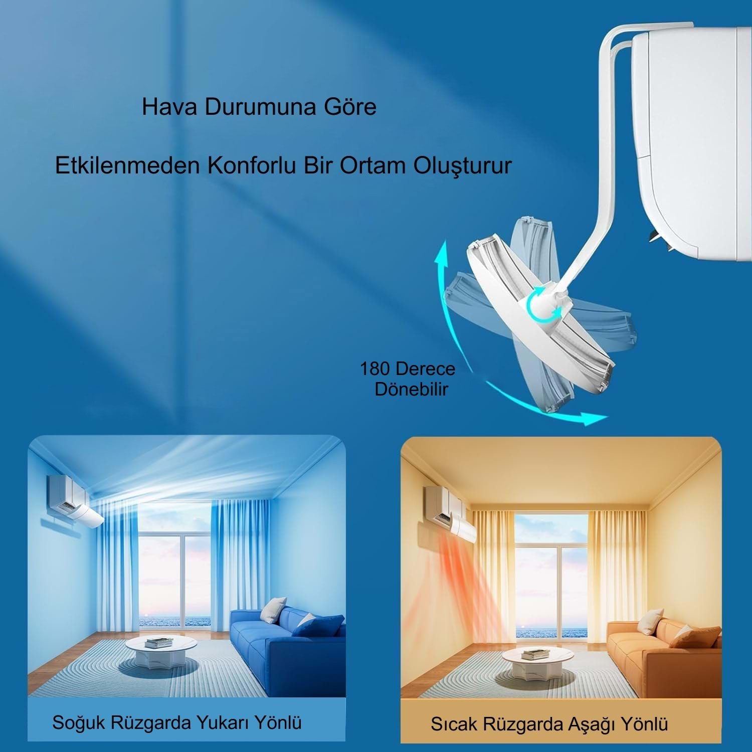 AYARLANABİLİR AÇI; Klima hava yönlendirici istediğiniz şekilde ayarlanabilir. Hava yönlendirici klimanın soğutmasını etkilemez ve uzaktan kumanda sinyalini engellemez. Panelde hava delikleri vardır kısmi hava geçişi sağlar ve yoğuşma olmaz.