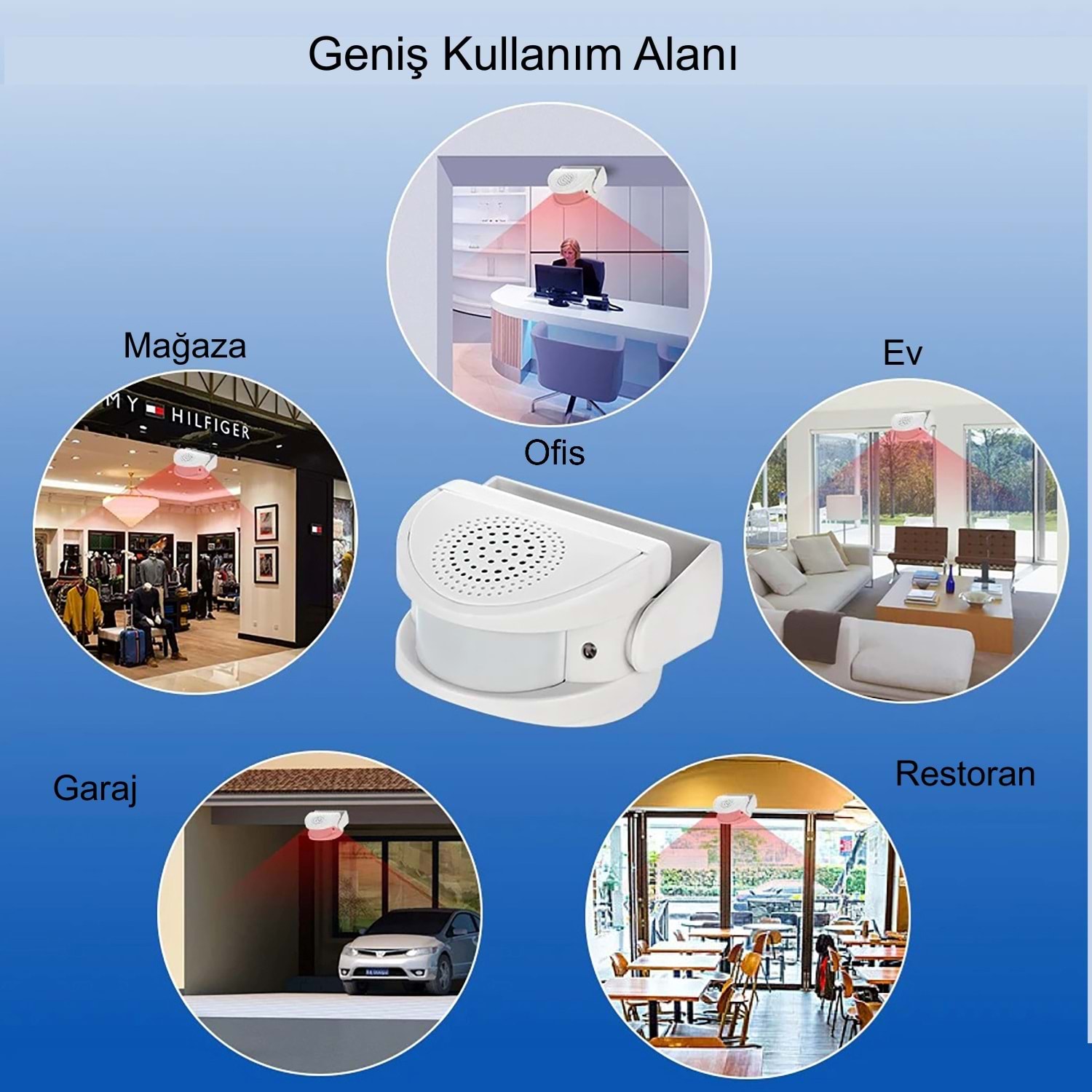 - GENİŞ KULLANIM ALANI: Mağaza, market, ofis, ev, depo ve benzeri iç mekanlarda kullanılabilir. Hem ziyaretçi karşılama hem de güvenlik alarmı olarak işlev görür.