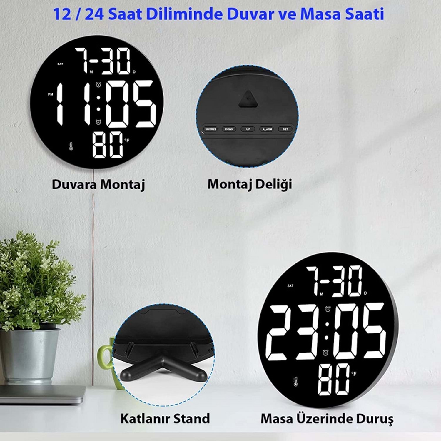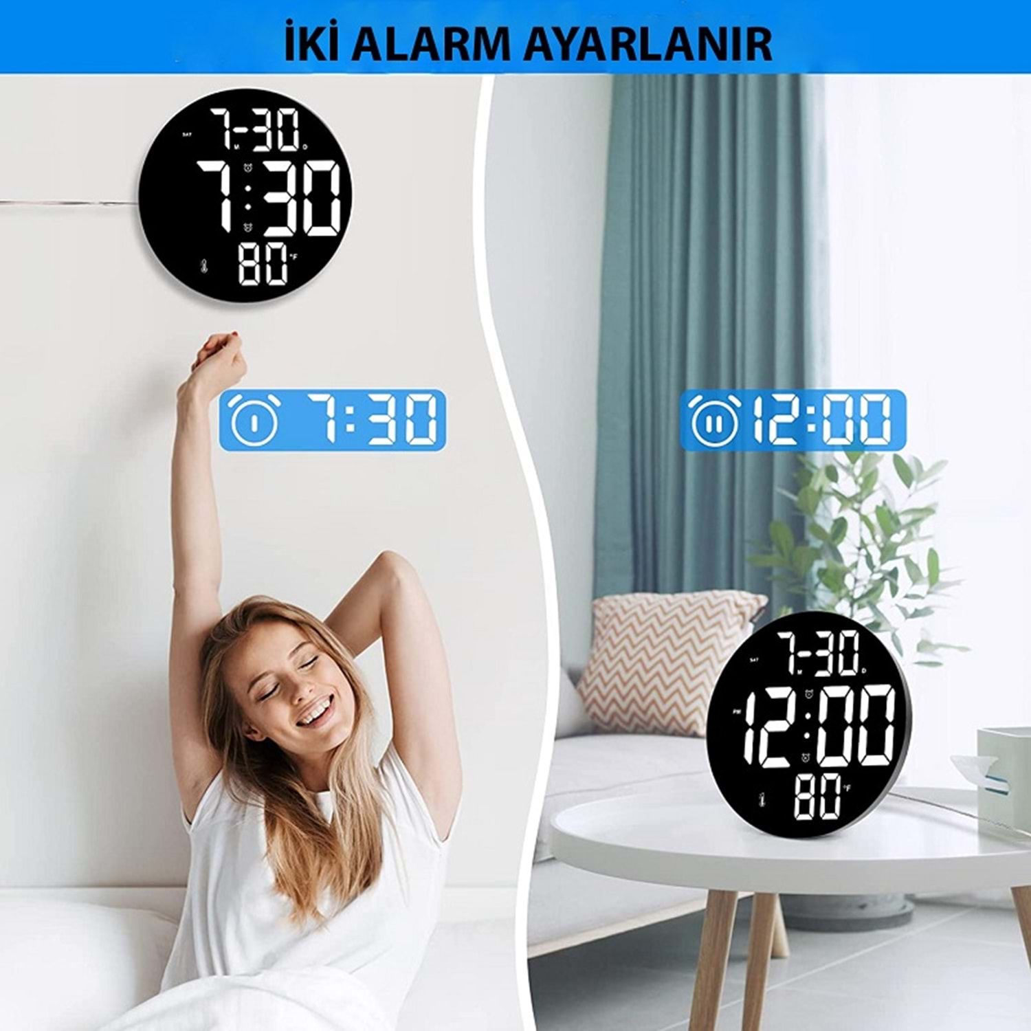 TriLine Dijital Modern 12inç Elektronik LED Duvar Masa Saati Sıcaklık Nem Alarm