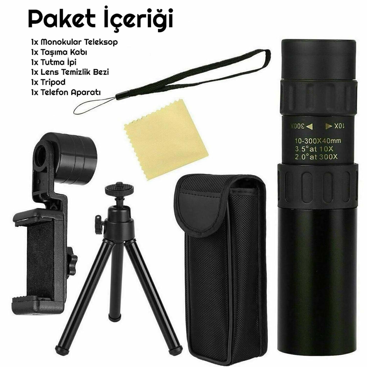 Telefon Bağlantı Aparatı-Tripod-Taşıma Çantası-Taşıma İpi-Temizlik Bezi